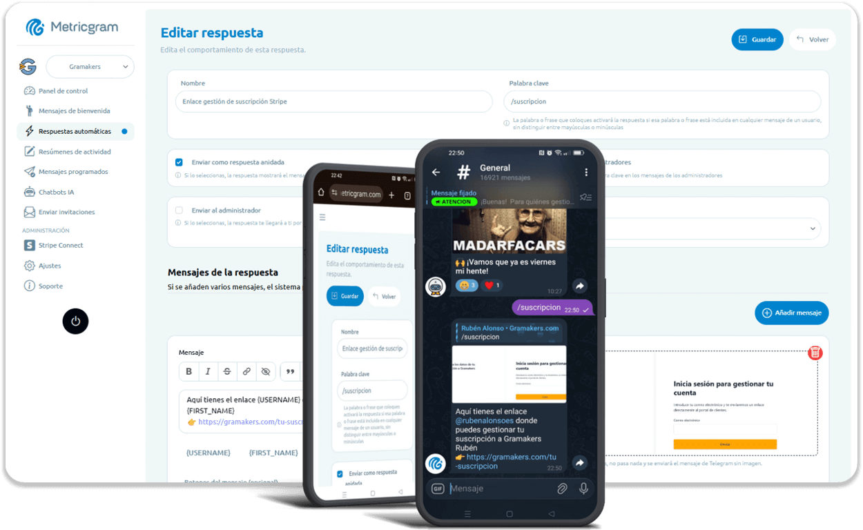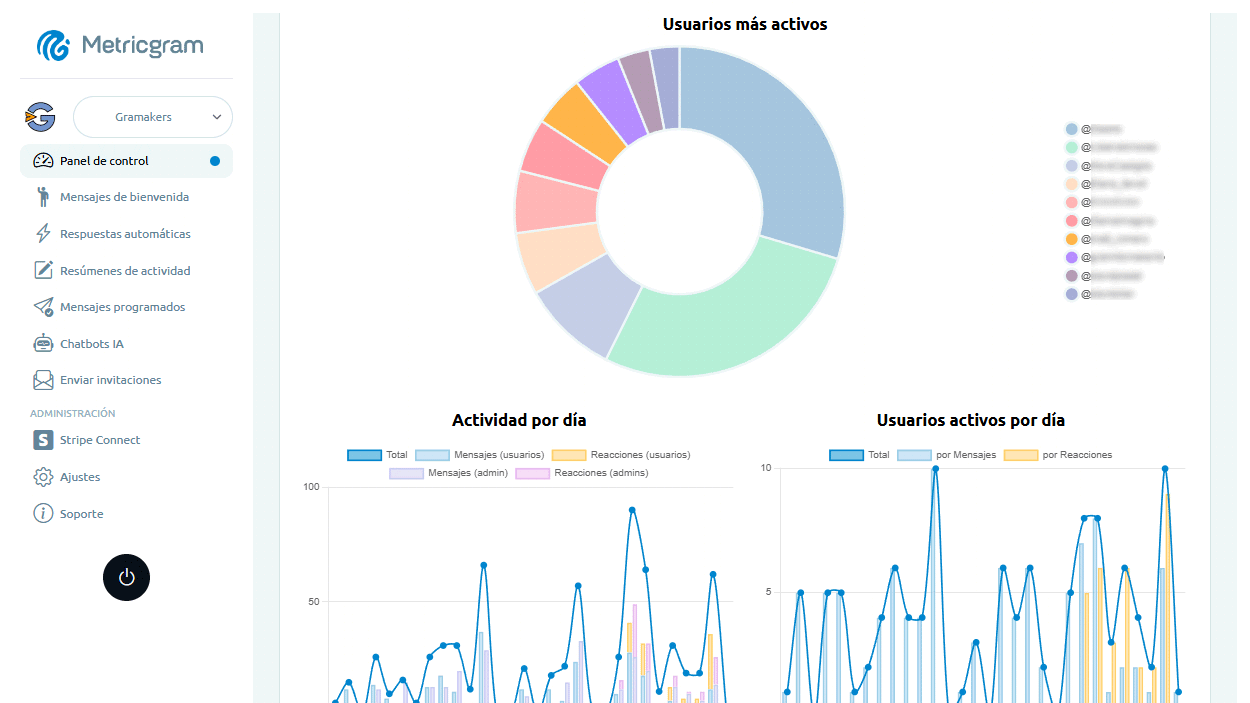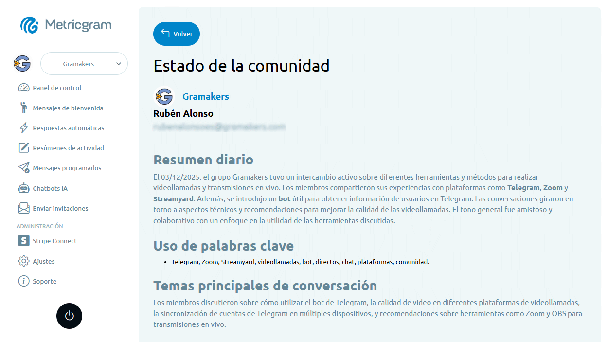 La verdad es que en MetricGram he encontrado todo lo que podía pedir para gestionar mucho mejor mi comunidad en Telegram: conexión con Stripe, IA integrada, automatizaciones... Y métricas, claro. Antes lo intentaba hacer de forma externa pero me daba más fallos que una escopeta de feria. Un problema menos y he notado más movimiento y salud en mis grupos desde que la uso.