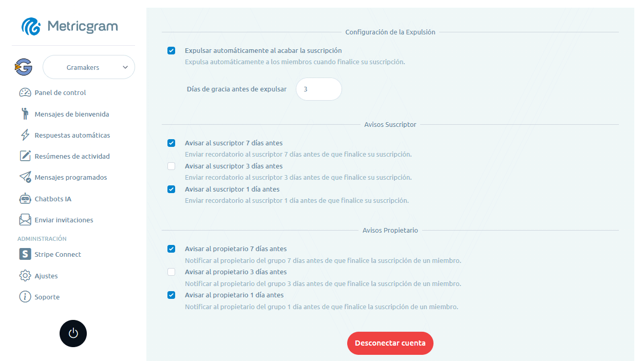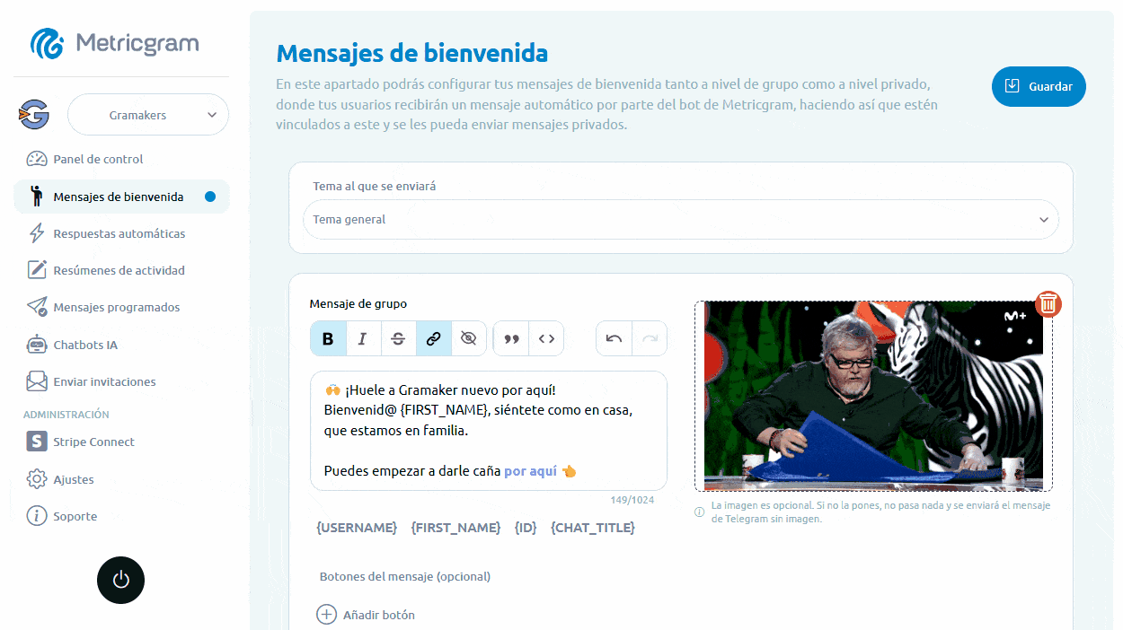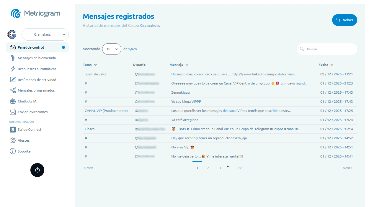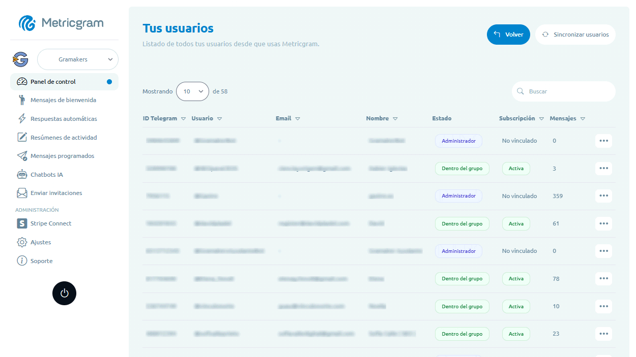 La verdad es que en MetricGram he encontrado todo lo que podía pedir para gestionar mucho mejor mi comunidad en Telegram: conexión con Stripe, IA integrada, automatizaciones... Y métricas, claro. Antes lo intentaba hacer de forma externa pero me daba más fallos que una escopeta de feria. Un problema menos y he notado más movimiento y salud en mis grupos desde que la uso.