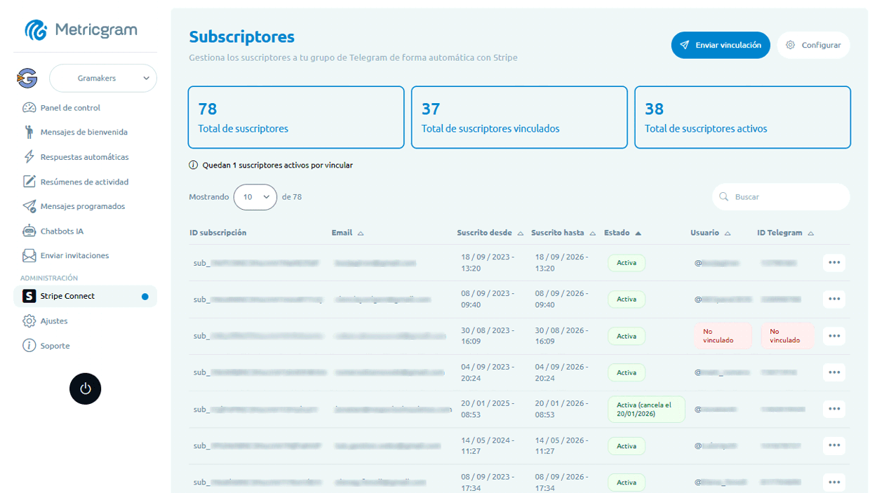 Automatiza el acceso a tu grupo conectando tu cuenta de Stripe. Te conectas, vinculas las suscripciones de tu comunidad, y Metricgram se encarga automáticamente de todo: